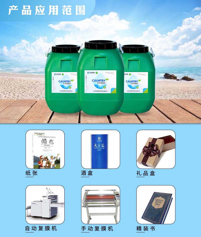 ? ?用于紙張與BOPP膜、PET膜等塑料薄膜的粘合,印刷包裝行業(yè)禮品盒、紙箱、酒盒、酒箱、手提袋等高中低檔紙質(zhì)盒子、箱子,復(fù)合產(chǎn)品干燥時間趕,忠于原色,無色相飄逸。